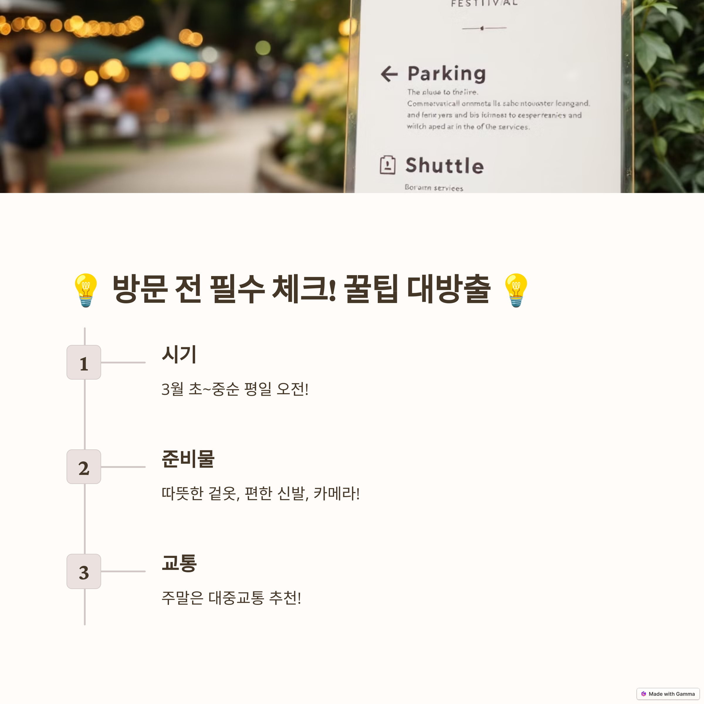 - 축제장 근처 임시 주차장이 운영되며, 셔틀버스 운행