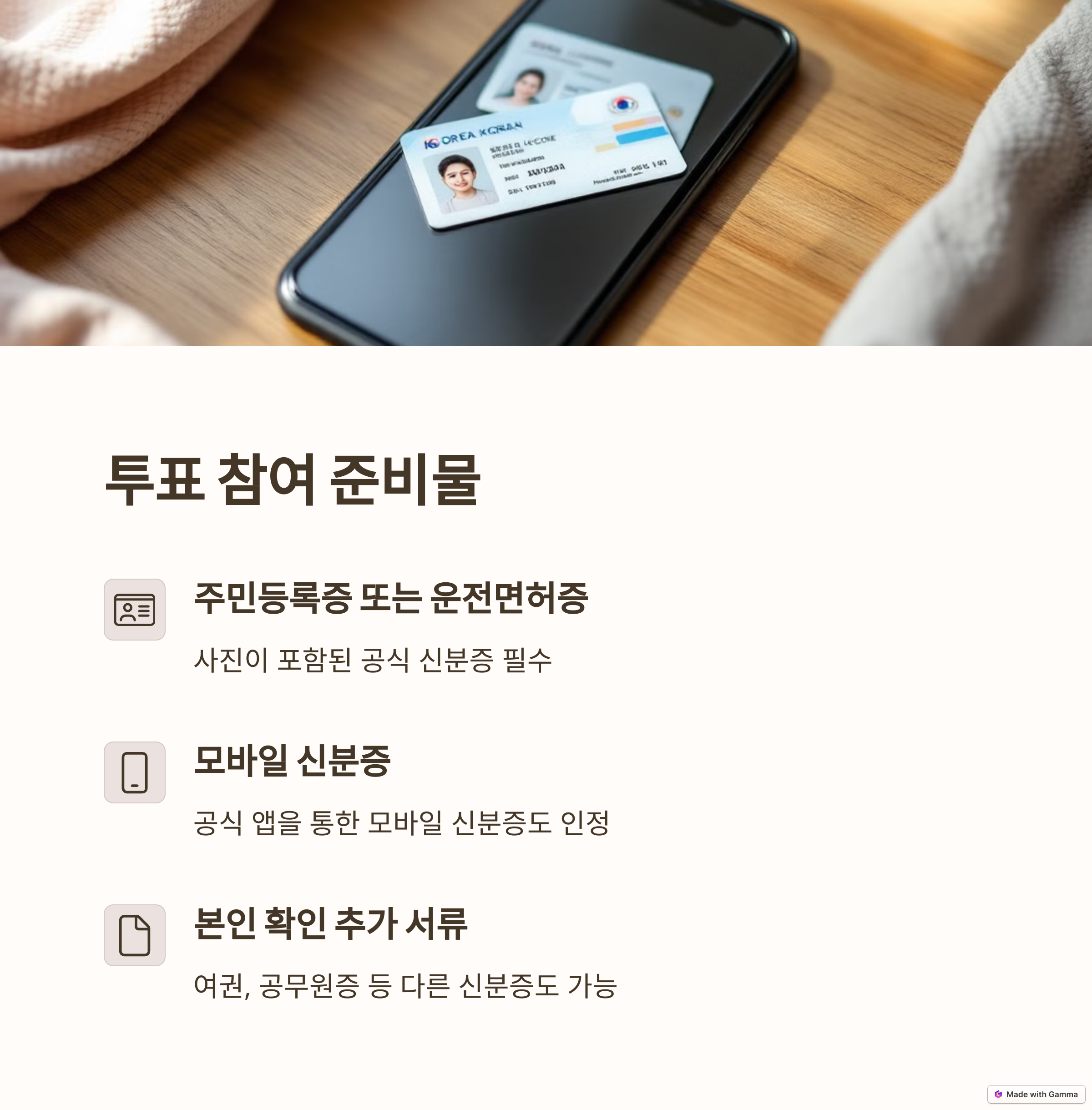 - 장소: 전국 모든 읍·면·동 사전투표소에서 가능 (주소지 무관)