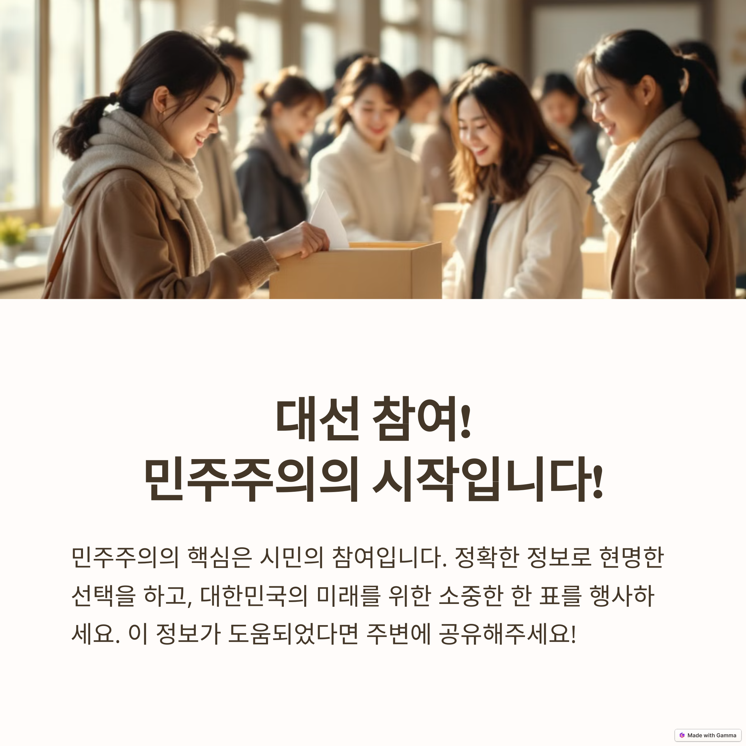 이번 조기 대선은 대한민국의 민주주의가 살아있다는 상징적 사건입니다. 급박한 상황 속에서도 국민 한 명 한 명의 ‘한 표’는 새 시대의 시작을 결정짓는 강력한 힘입니다.