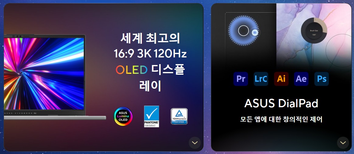 - 3K OLED 디스플레이: 15.6인치 ASUS Lumina OLED 화면은 2880x1620 해상도와 120Hz 주사율을 자랑합니다. 600니트 밝기와 100% DCI-P3 색역으로 영화 감상, 사진 편집 모두에 최적화됐습니다.